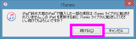 ライブラリに転送されていない項目があると、このような警告が表示されることもありますが、「続ける」をクリックします。
