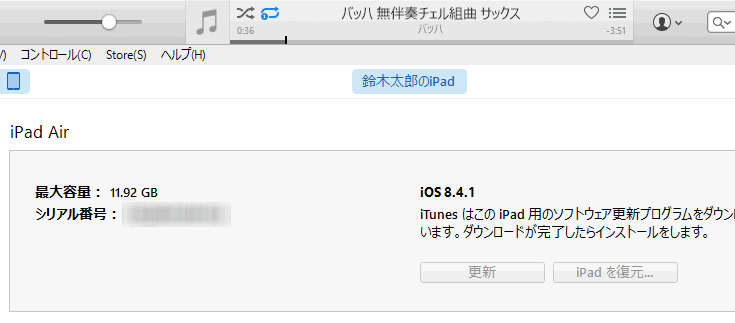 iTunesを立ち上げ、パソコンとiPhoneやiPadをUSBケーブルで接続すると、自動的にアップグレード用の画面が表示されました。