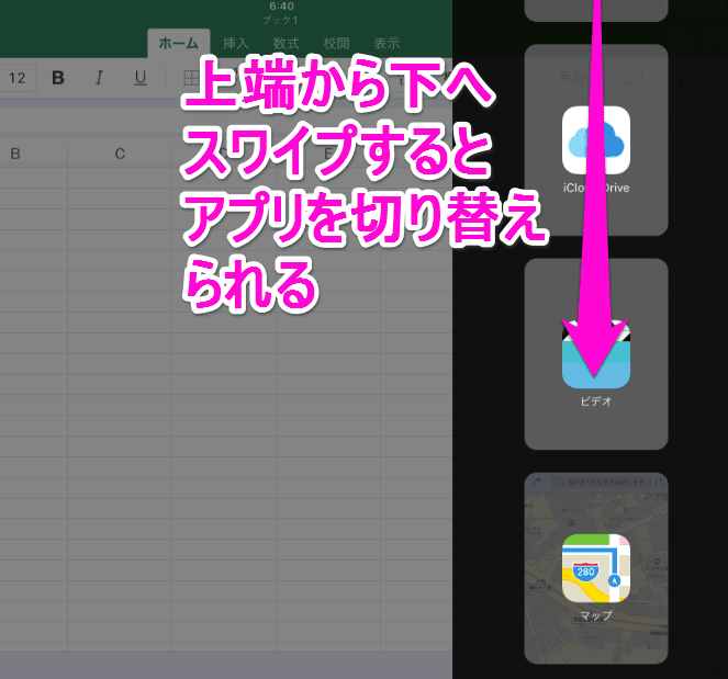 上端から下にスワイプすると、アプリを切り替えることが出来ます。