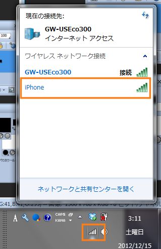 iPhoneのインタネット共有をオンにしたら、パソコンのタスクバーにあるWi-Fiのアイコン(丸で囲った部分)をクリックします。