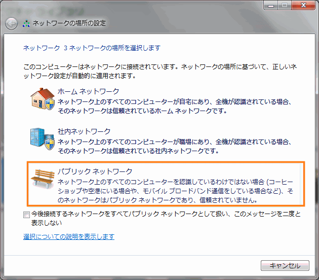 場合によってはこのような「ネットワーク場所の設定」が表示されるかもしれません。