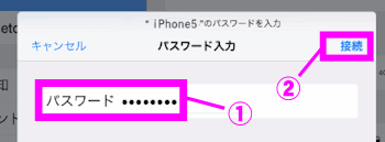 先ほどiPhoneのインターネット共有の設定画面で表示された"Wi-Fi"のパスワードを入力します。