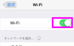続いて、左の上の方にある「Wi-Fi」をタップし、右側のWi-Fiがオン(緑色)になっていることを確認します。