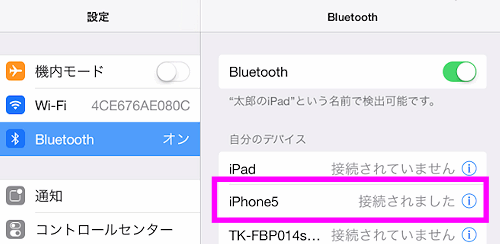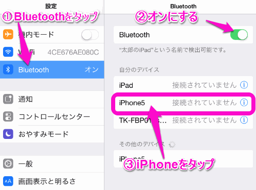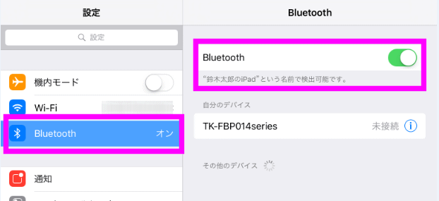 iPhone側も、iPad側もBluetoothをオンにします。