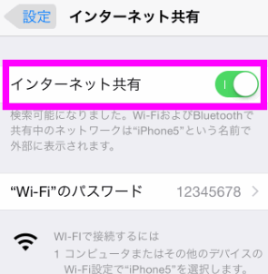 「インターネット共有」をオン(緑色)にします。