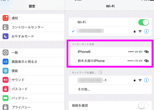 続いてiPadでiPhoneのテザリングを利用して、インターネットに接続する方法を紹介します。上の方法で、iPhoneの「インターネット共有」をオンにしておきます。