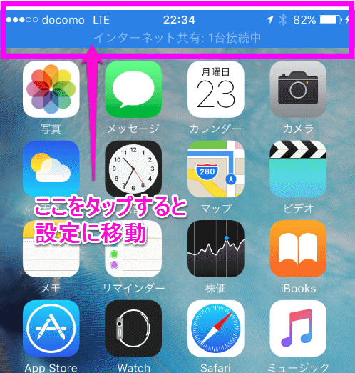 テザリング中、iPadやノートパソコンなどが接続されている場合は、このように画面上部に青い帯になっていて、現在接続している機器が何台あるか表示されます。