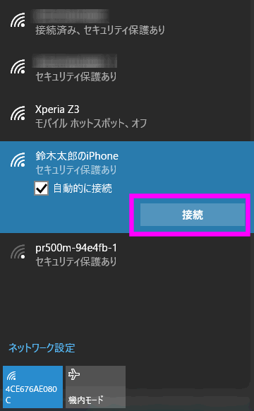 なお、「自動的に接続」にチェックを入れておくと、次回以降、iPhoneのテザリングをオンにしておくと自動で接続してくれます。