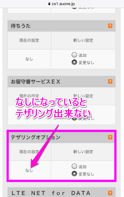 テザリングオプションがこのように「なし」になっていると、テザリングオプションの契約をしないとテザリングは使えません。また、この場合は、月々500円の料金が発生します。