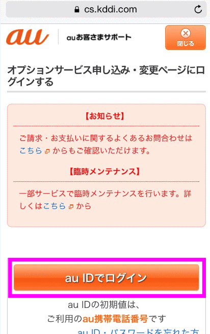 auの場合は、au IDとパスワードを入力してログインします。