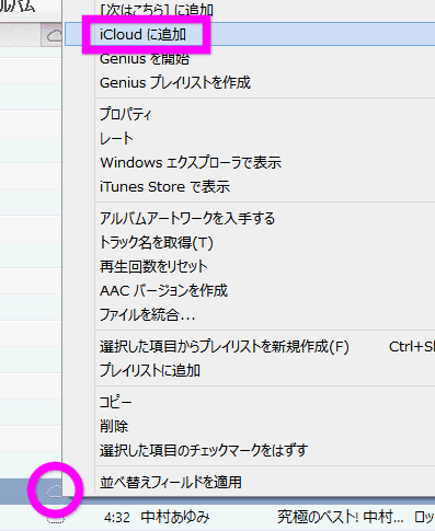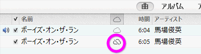 別のパソコンに存在しない音楽ファイルで、iCloudにアップロードされている場合は、このようなマークになります。
