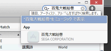 自宅のデスクトップのみしか保存されていない曲を、会社のノートパソコンで検索すると、Matchをオンにする前は見つかりませんでした(表示されているのはアプリ)。