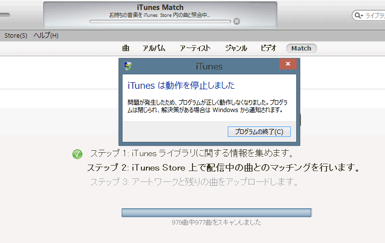 デスクトップの方もノートパソコンの方も、Matchで曲をアップロードしている最中にiTunesが強制終了してしまう症状が度々起きました。