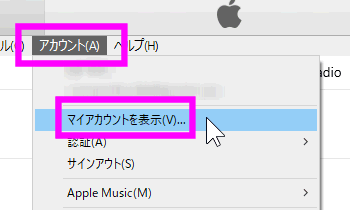 すべてのパソコンの認証を一気に解除する場合は、iTunesの「アカウント」をクリックし、「マイアカウントを表示」をクリックします。