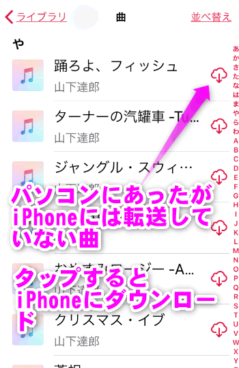 雲のアイコンが表示されている曲は、まだiPhoneにはダウンロードしていない曲、という意味です。この雲のアイコンをタップするとダウンロードが開始されます。